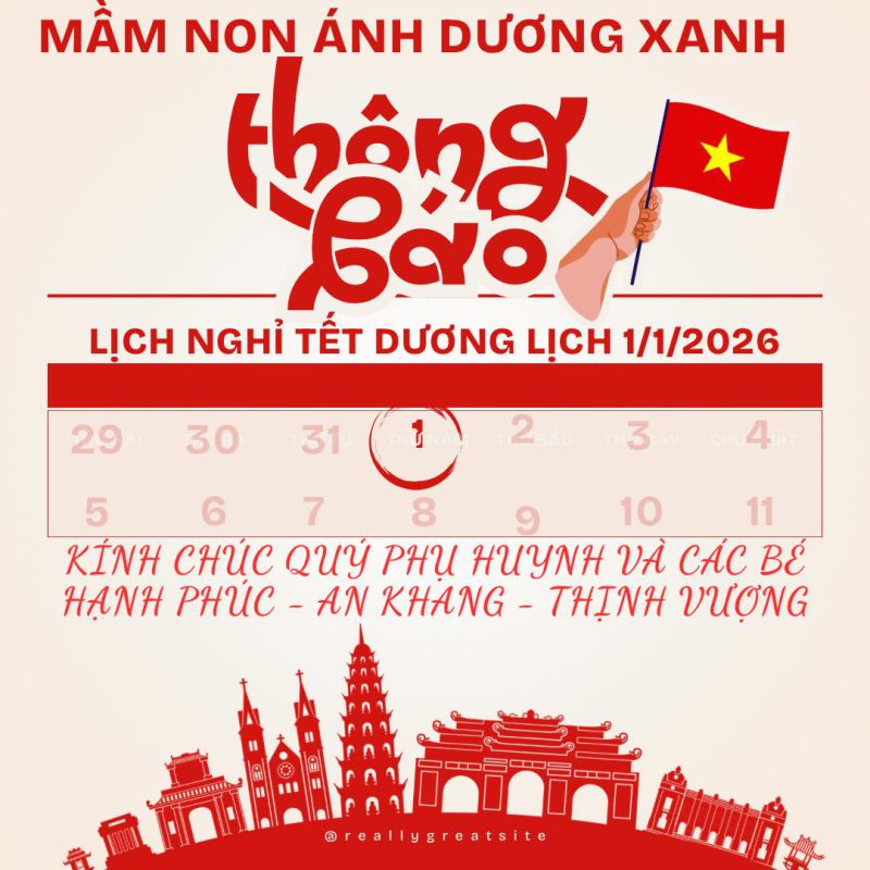 THÔNG BÁO LỊCH NGHỈ TẾT DƯƠNG LỊCH 2026 Mầm non Ánh Dương Xanh xin trân trọng thông báo tới Quý quý phụ huynh lịch nghỉ Tết Dương lịch 2026 cụ thể như sau: Mầm non Ánh Dương Xanh trân trọng cảm ơn sự tin tưởng và đồng hành của Quý phụ huynh suốt thời gian […]